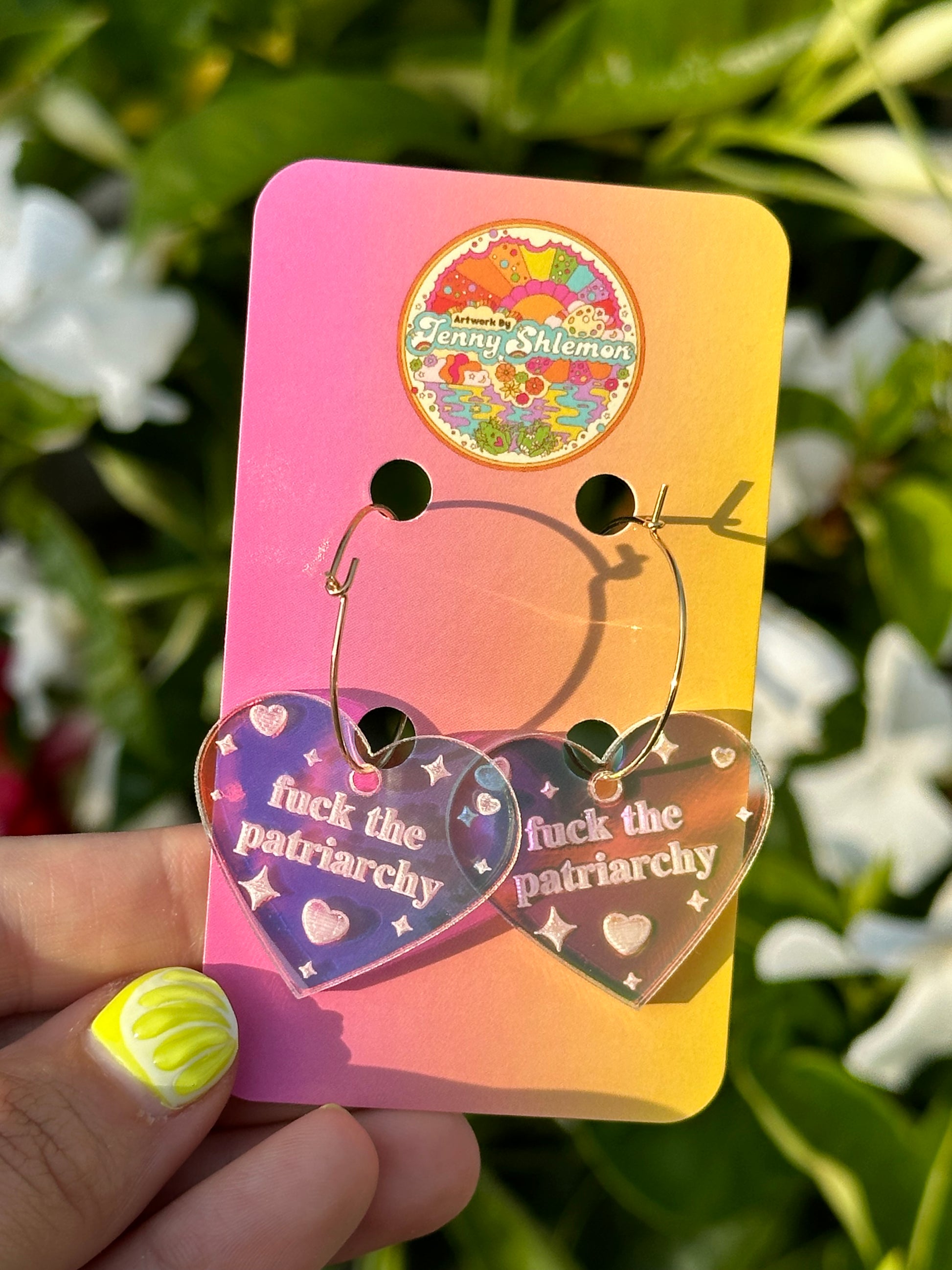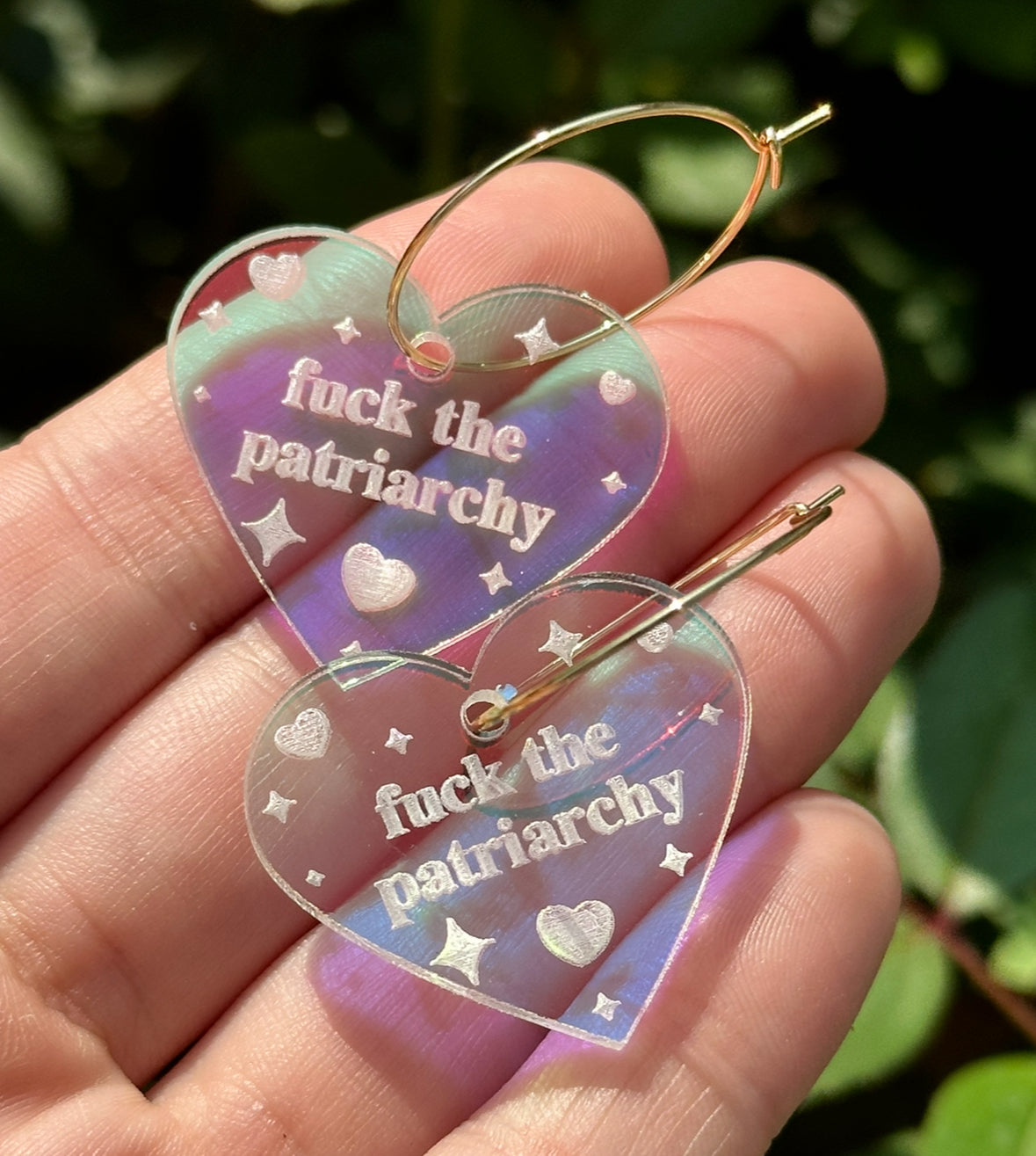 Iridescent Fuck The Patriarchy Heart Hoop Earrings