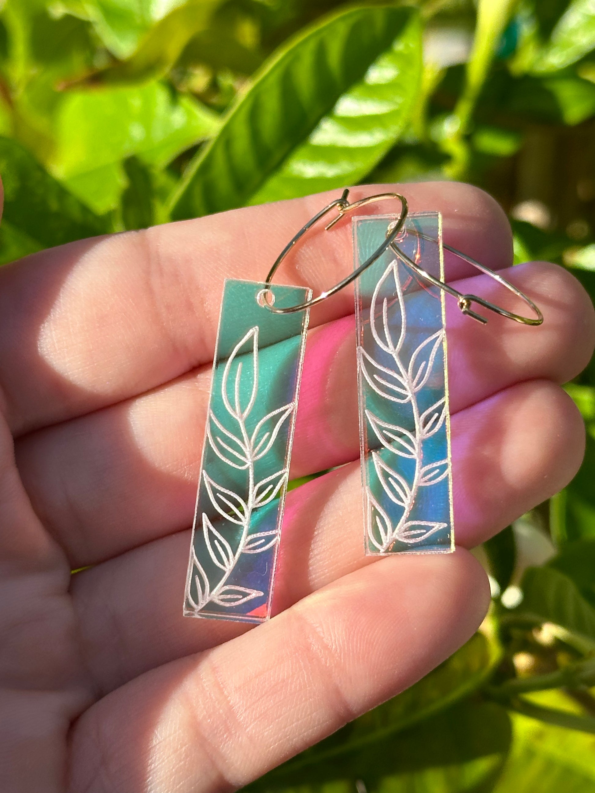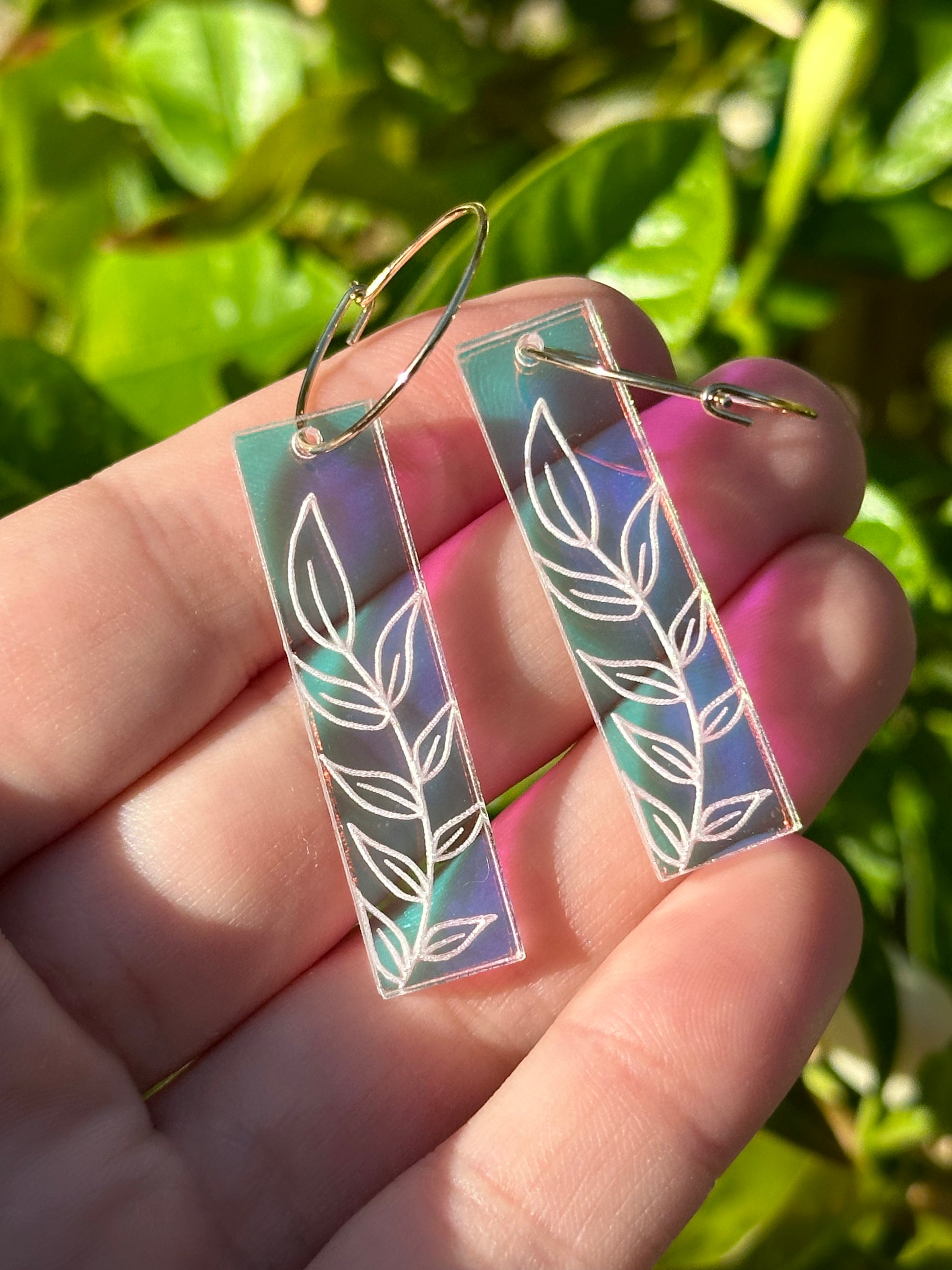 These are stunning earrings in a rectangle shape that is 1.5 inches tall and less than one inch thick. These are made with my hand drawn Veronica floral design. They are made with iridescent acrylic and come on a small surgical steel hoop. The hoops are nickel free.