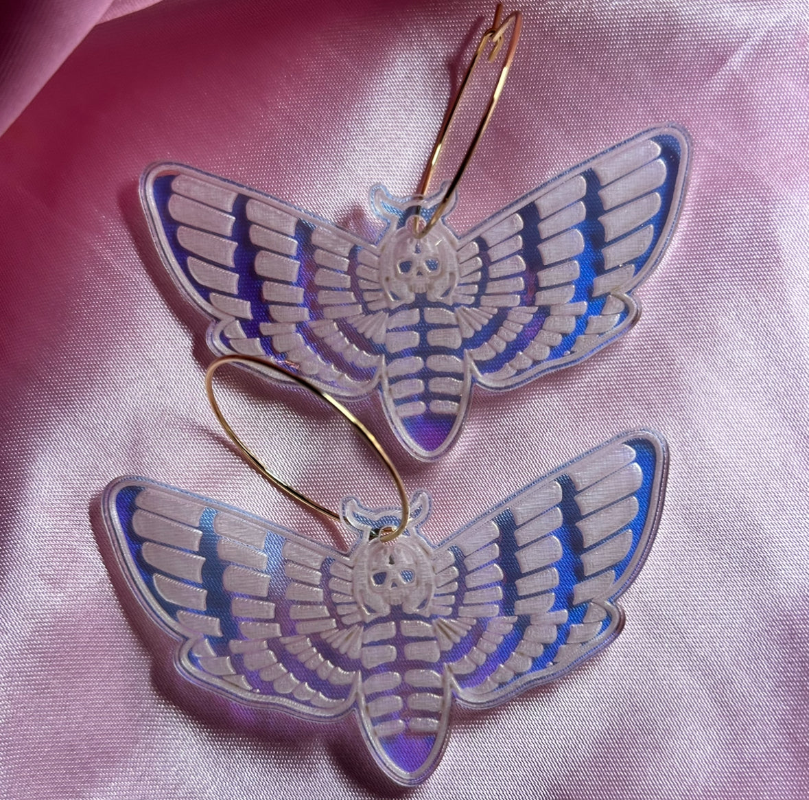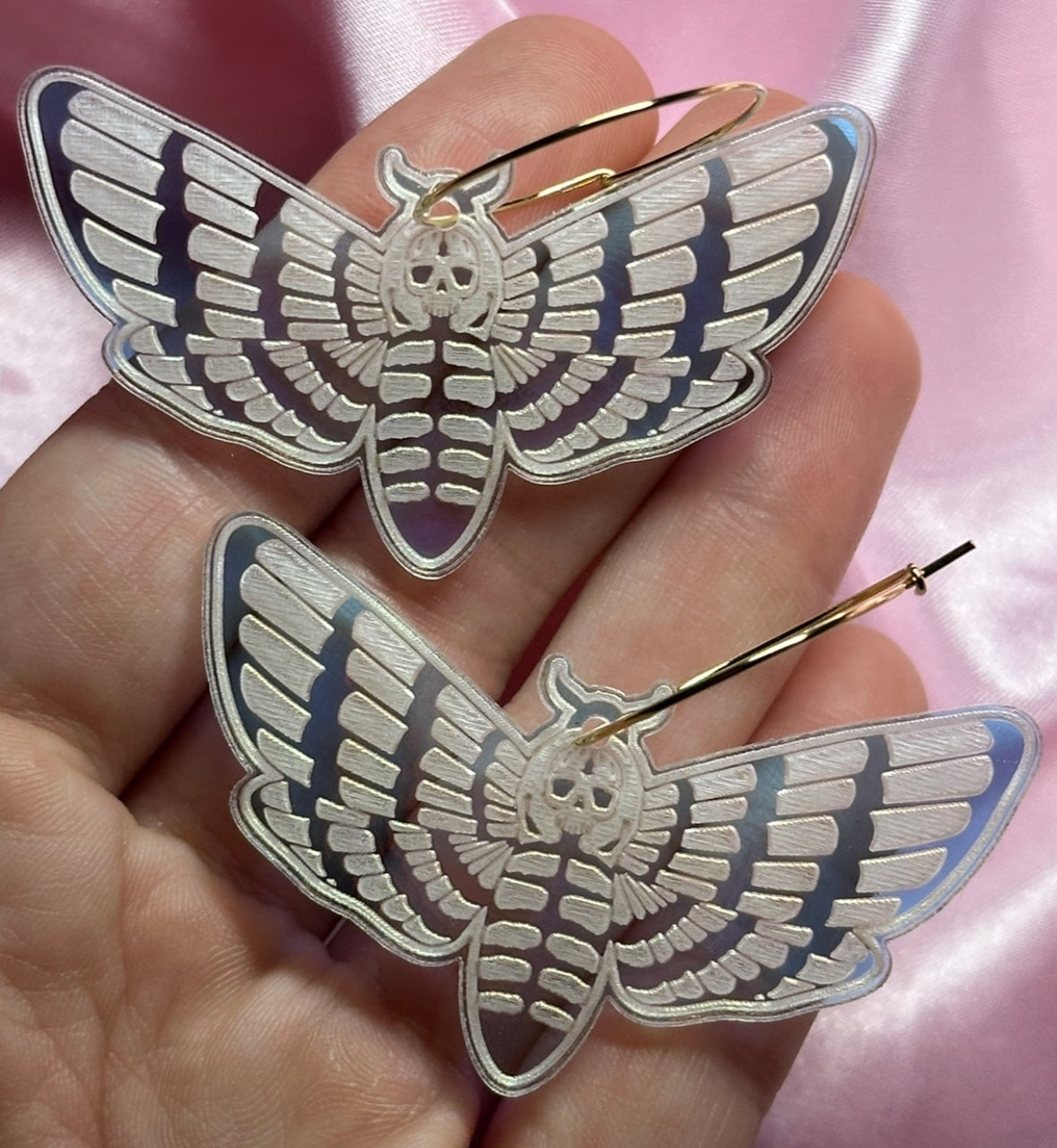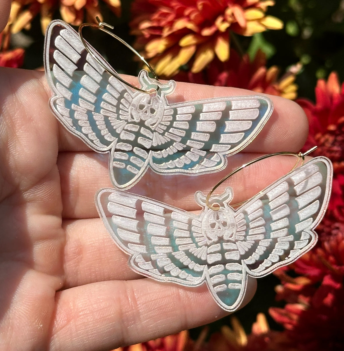 I drew my own design and created these Death's Head Hawkmoth Earrings! This is a larger more statement piece. The moth is 2.3 inches wide and 1.3 in height. They come on a medium sized surgical steel hoop.