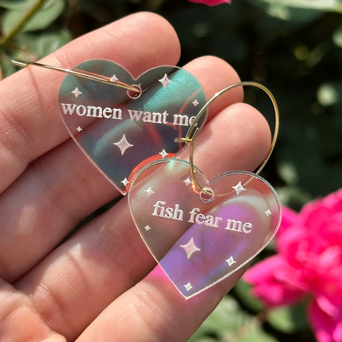 Iridescent Women Want Me Fish Fear Me Heart Hoop Earrings