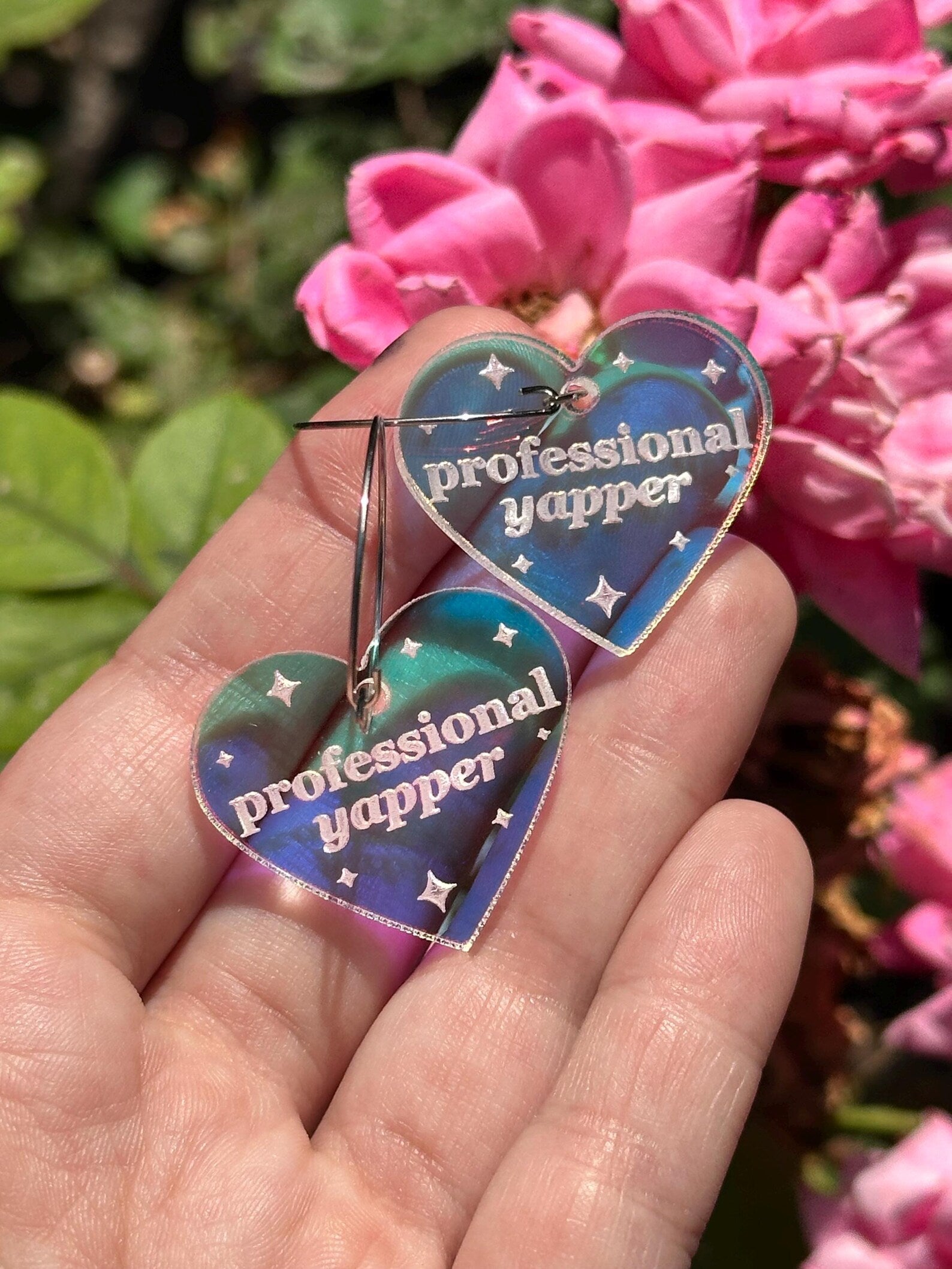 These are colorful earrings made with iridescent acrylic. The iridescent is colorshifiing and a bit translucent.